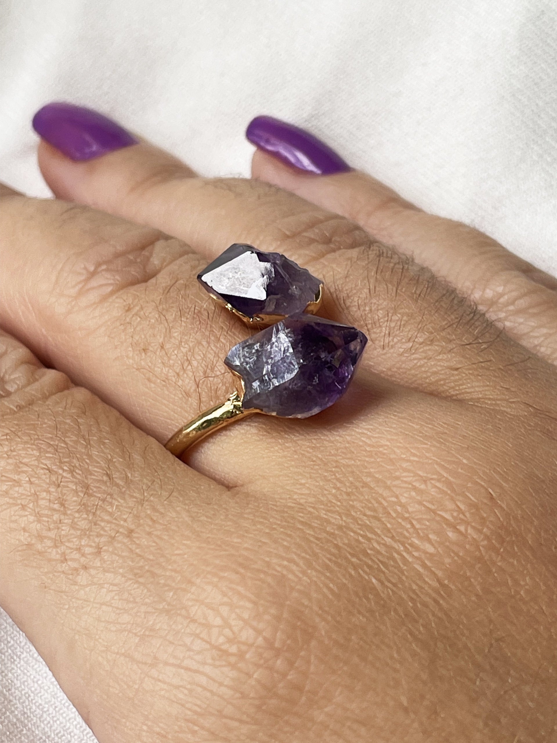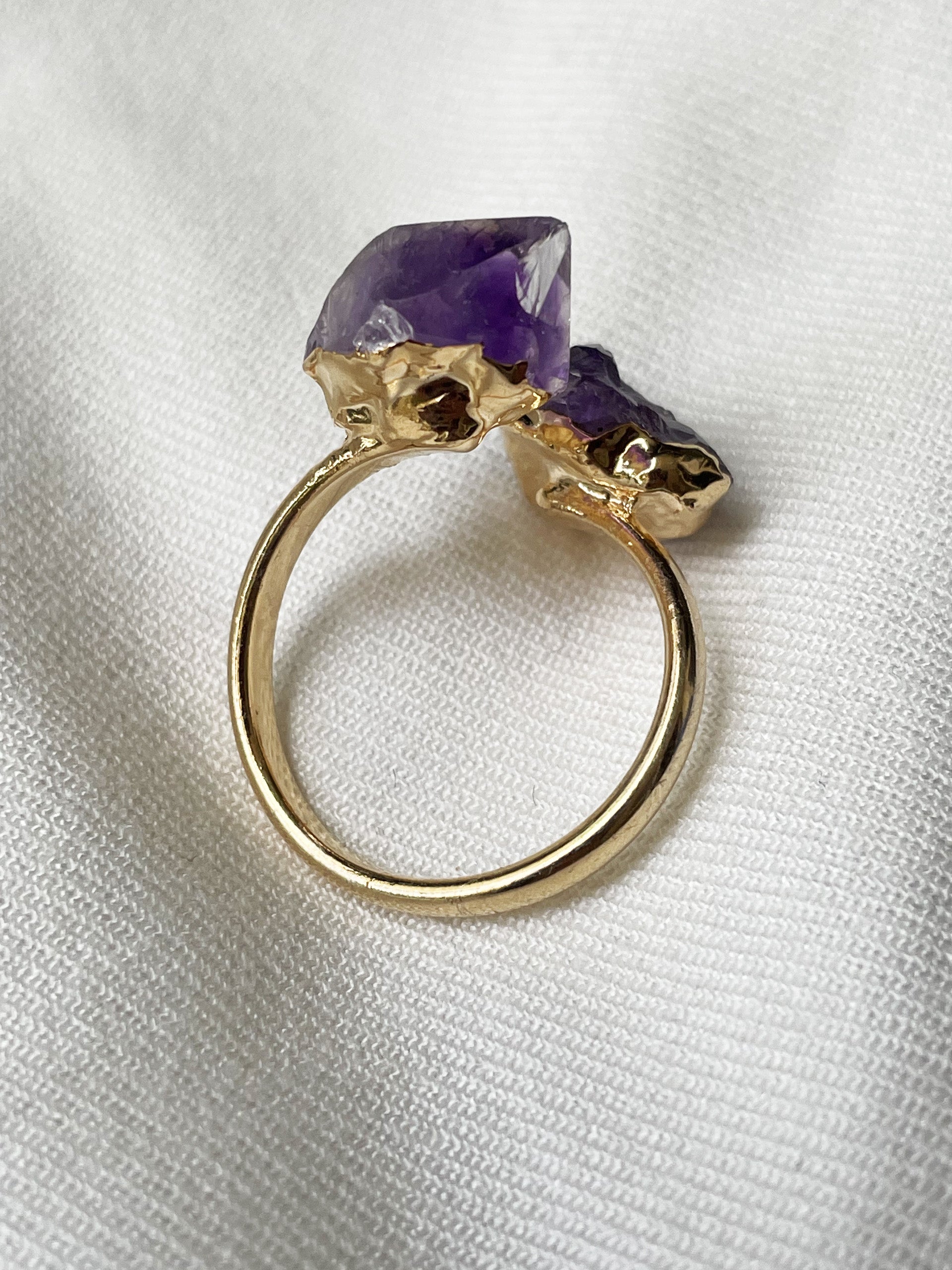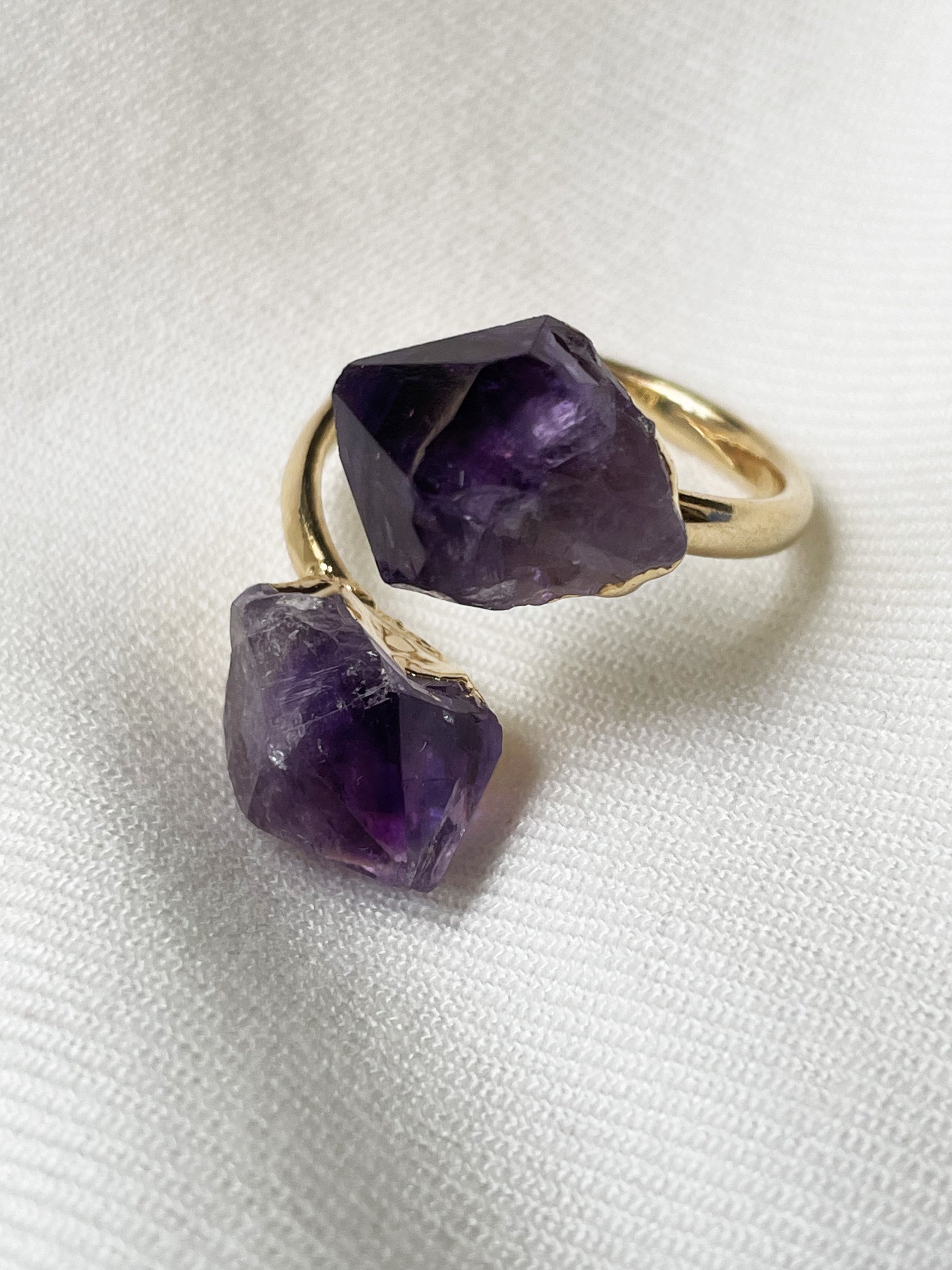 O Anel Bruto de Ametista é uma joia única, adornada com uma ametista bruta de alta qualidade.