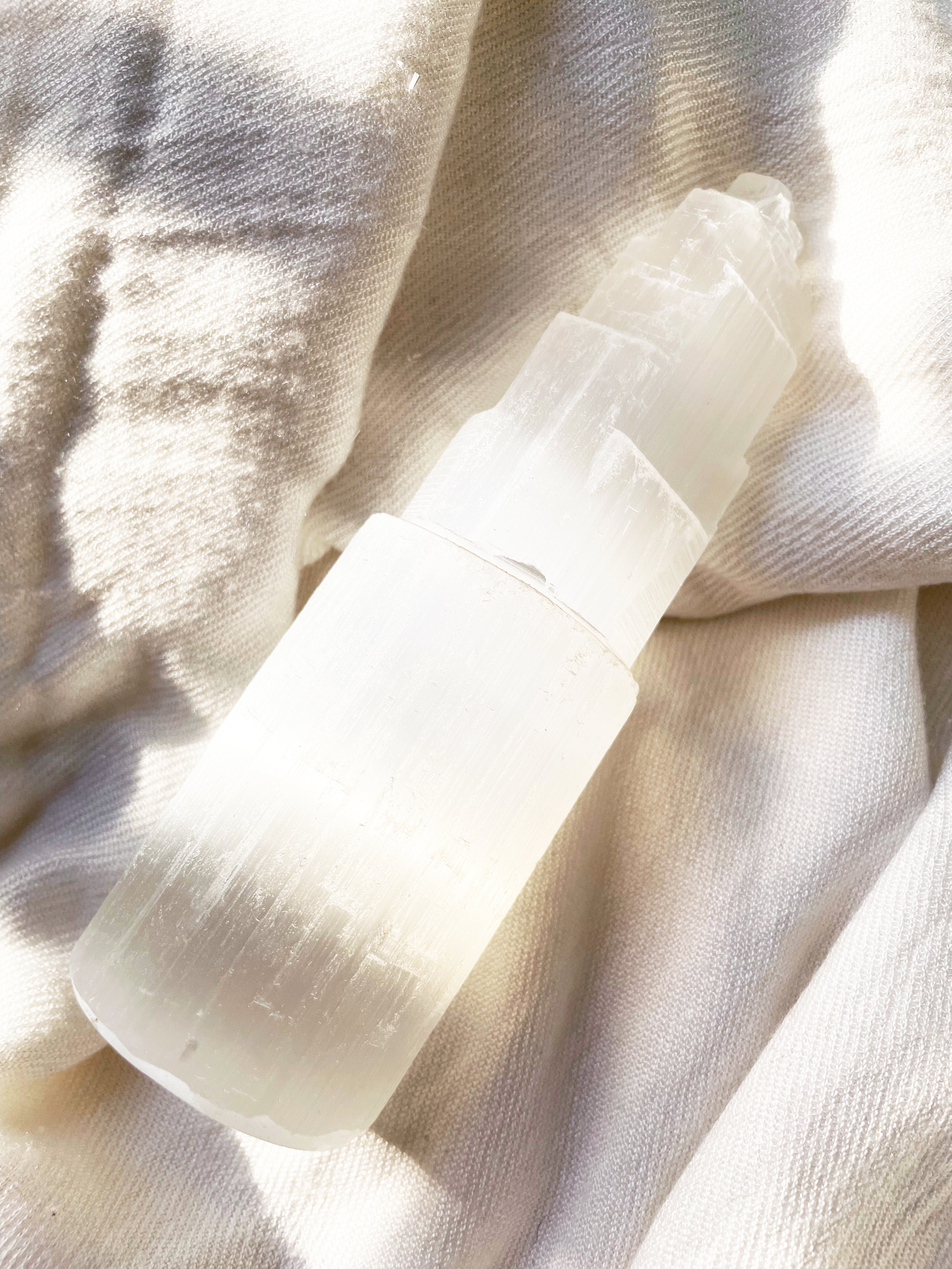 De origem ligada à deusa grega Selene, seu brilho branco lembra a lua e simboliza conexão espiritual, intuição e proteção. Autolimpante, a Selenita ainda tem a capacidade única de limpar e recarregar outros cristais.